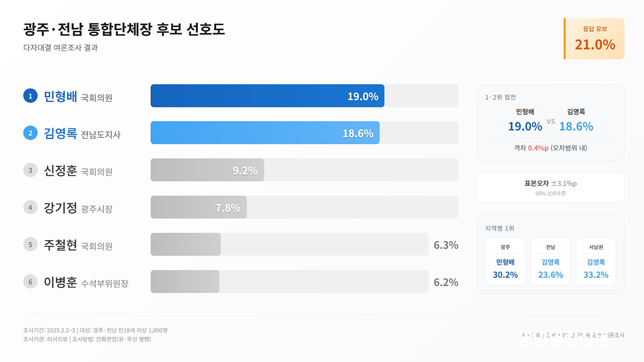 ϺKBC ֹ ġ信 Ƿ 2~3 ֡ 18 ̻ õ 1,000 ǽ , մü ڴῡ ǿ 19.0%, 迵 簡 18.6% 0.4%p ̸ (ǥ 3.1%p). ̾ ǿ 9.2%, ֽ 7.8%, ö ǿ 6.3%, ̺ Ҿִ ȣƯ 6.2% ̾. Ҿִ ĺ յ 翡 ǿ 18.5%, 迵 16.8% ̾.